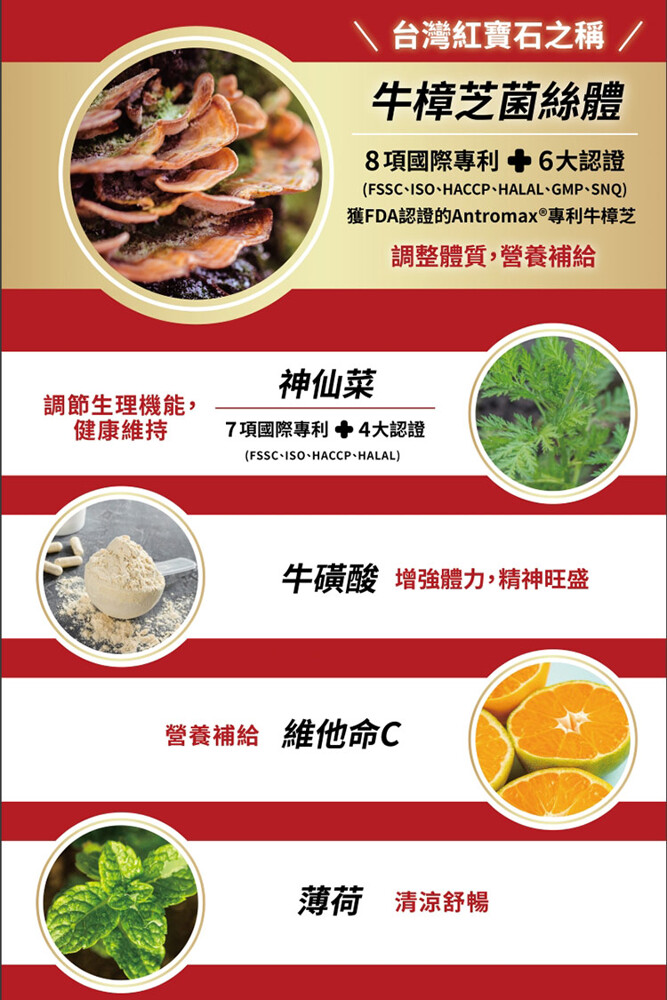 全成分:砂糖、麥芽糖、椰子油、明膠、檸檬酸(調味劑)、檸檬濃縮果汁、維生素C(抗氧化劑)、香料、牛樟芝菌絲體(Antrodia cinnamomea固態培養)、牛磺酸、神仙菜萃取物RabenLiv(含HCP774)(麥芽糊精、神仙菜萃取物)、天然食用色素(薑黃色素)、薄荷、棕櫚蠟(食品製造用劑)。