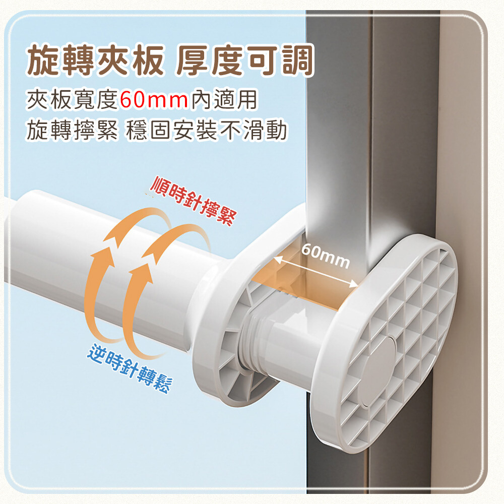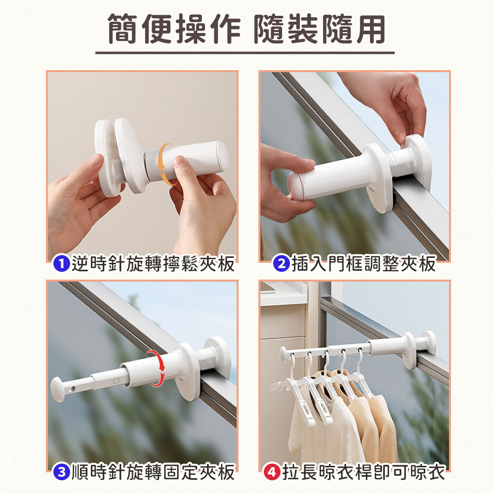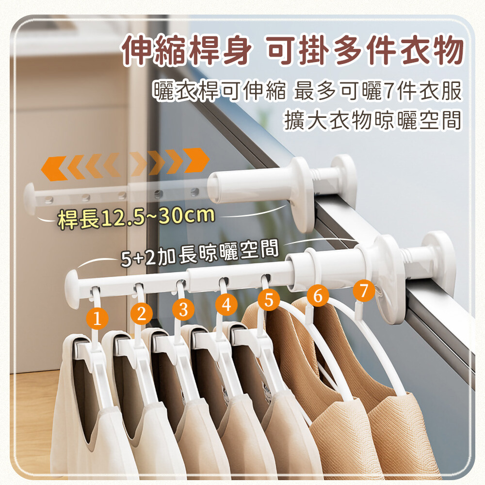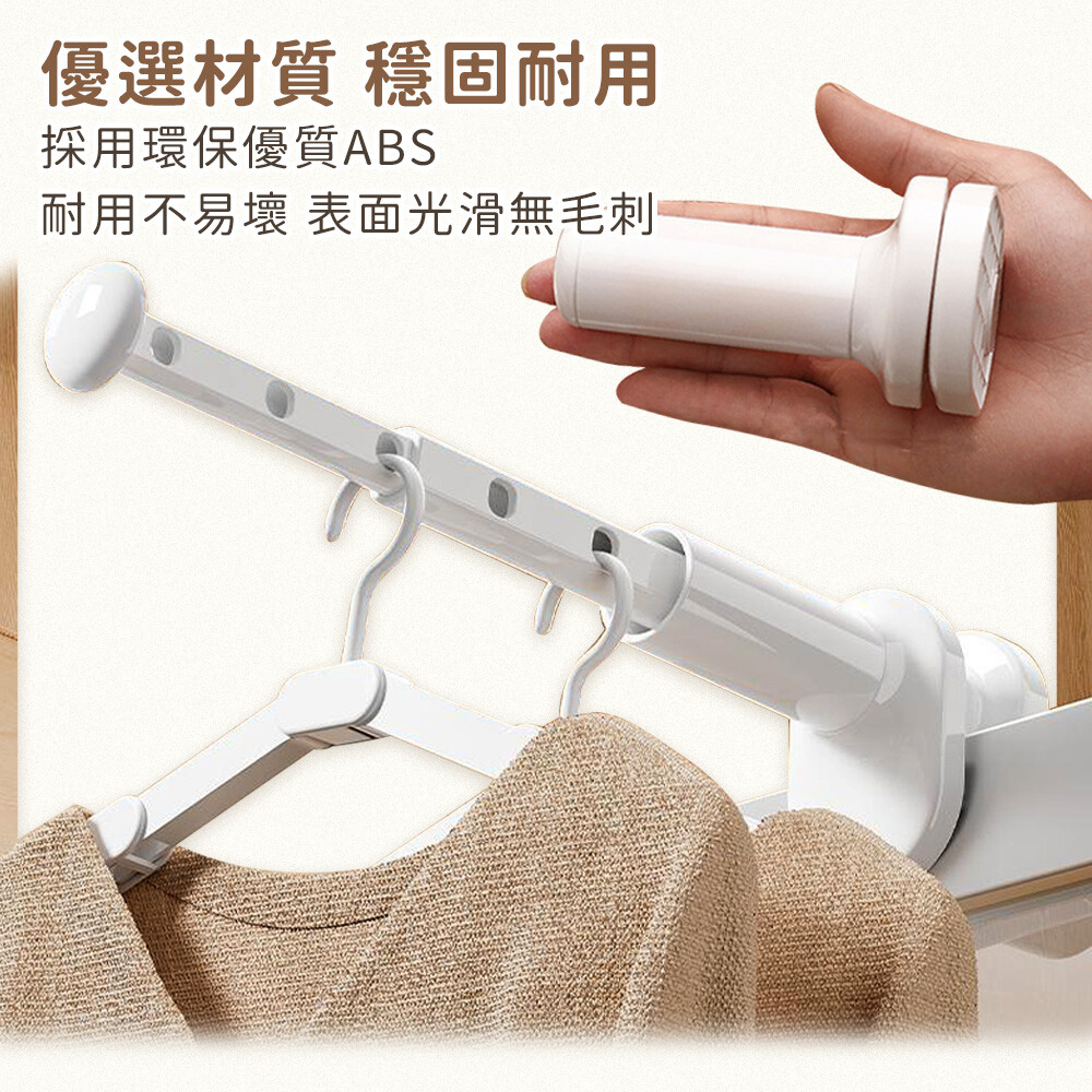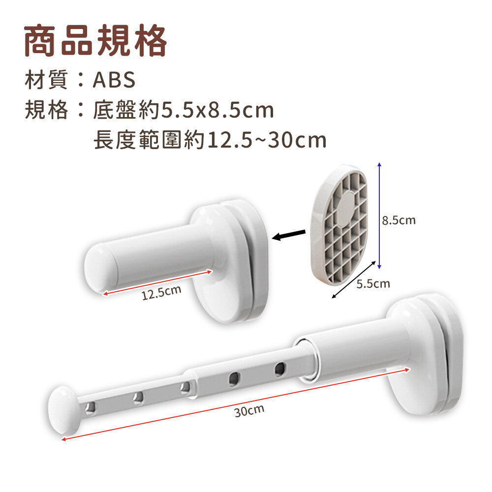 移動固定板,可調整各種寬度,卡扣在櫃門板上,靈活運用空間, 五孔設計,最多可掛七件衣服,旅行居家都適合,伸縮桿身,不用時可縮短收納,小巧體積好攜帶。 ●材質:ABS ●尺寸:長約12.5~30cm ●顏色:白色 ●產地:中國