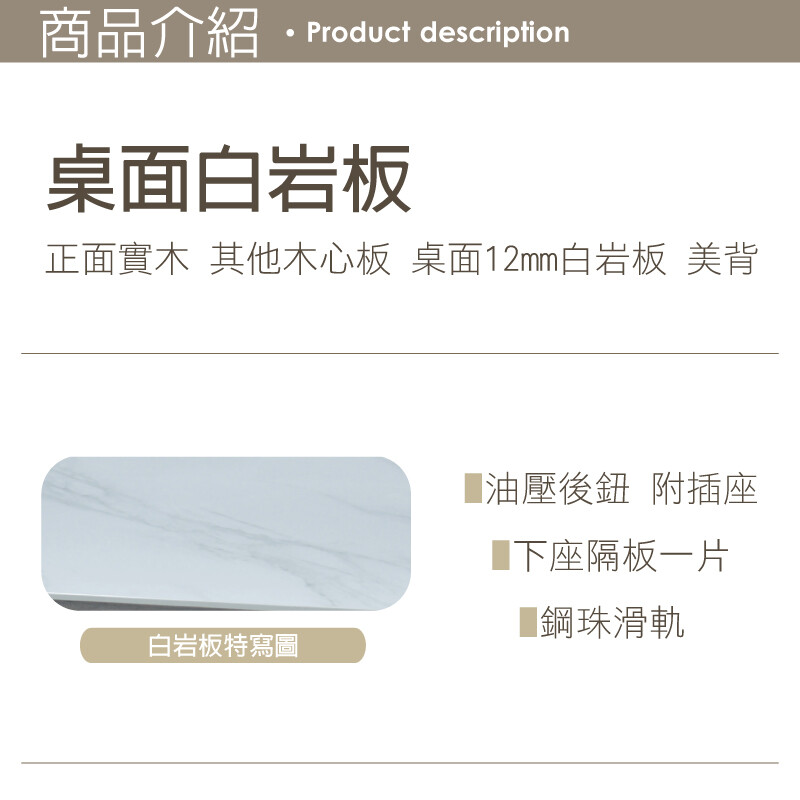 桌面12mm白岩板 油壓後鈕 鋼珠滑軌