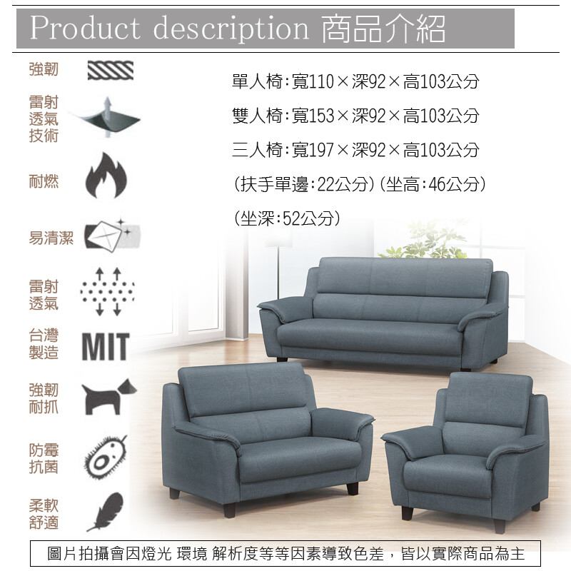 扶手單邊:22公分,坐高:46公分,坐深:52公分