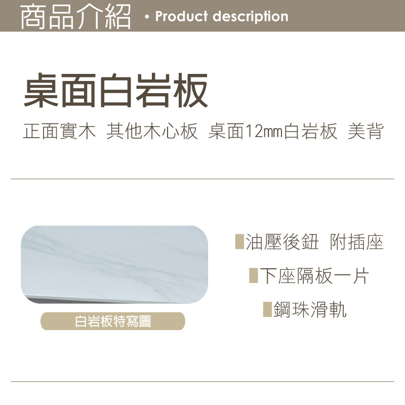 桌面12mm白岩板 油壓後鈕 鋼珠滑軌