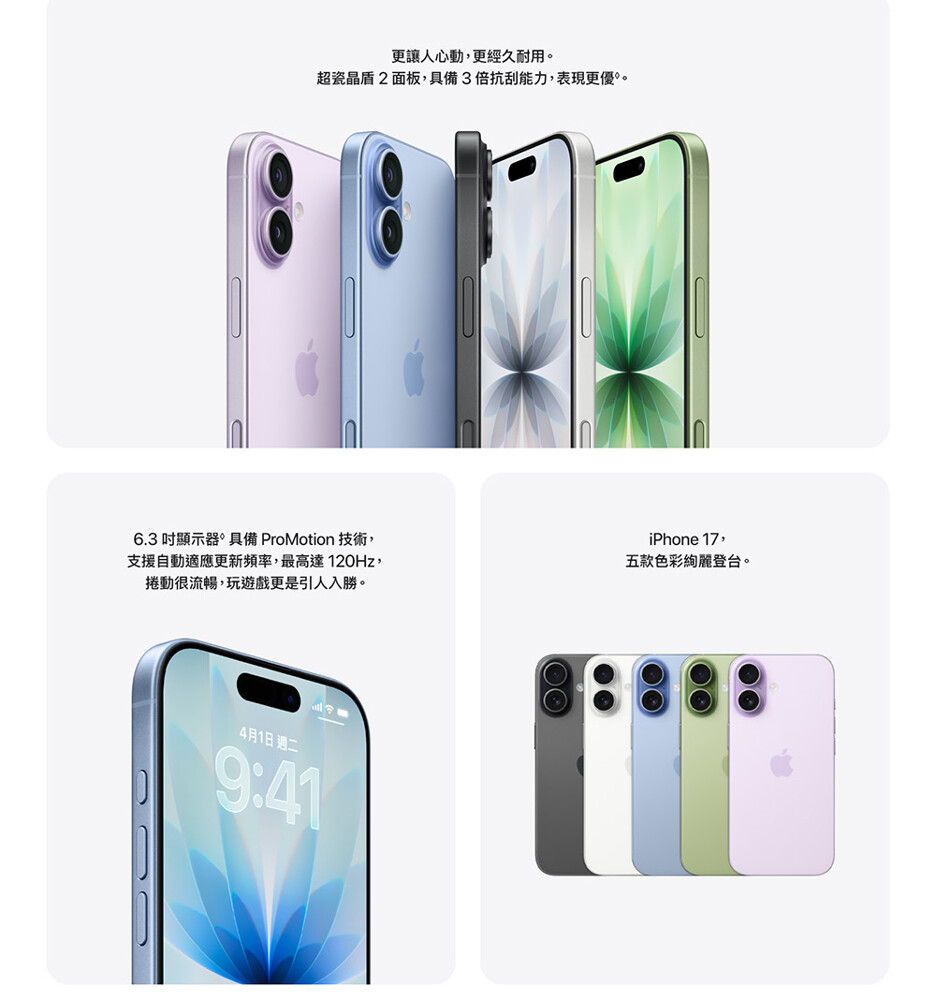 Apple iPhone 17 機身正面覆蓋超瓷晶盾 2 面板,整體較前一代提升 3 倍抗刮能力,搭配鋁金屬中框設計,重量僅有 177g;擁有 IEC 60529 標準的 IP68 防塵防水等級,可在最深達 6 公尺水中待最長 30 分鐘的時間。機身除了設有電源鍵及音量鍵外,同樣保留動作按鈕、相機控制鍵等配置。