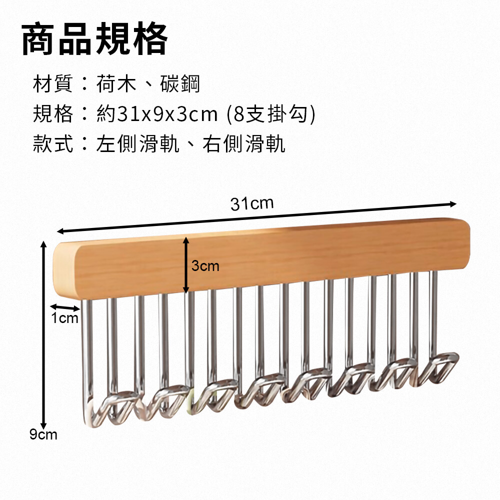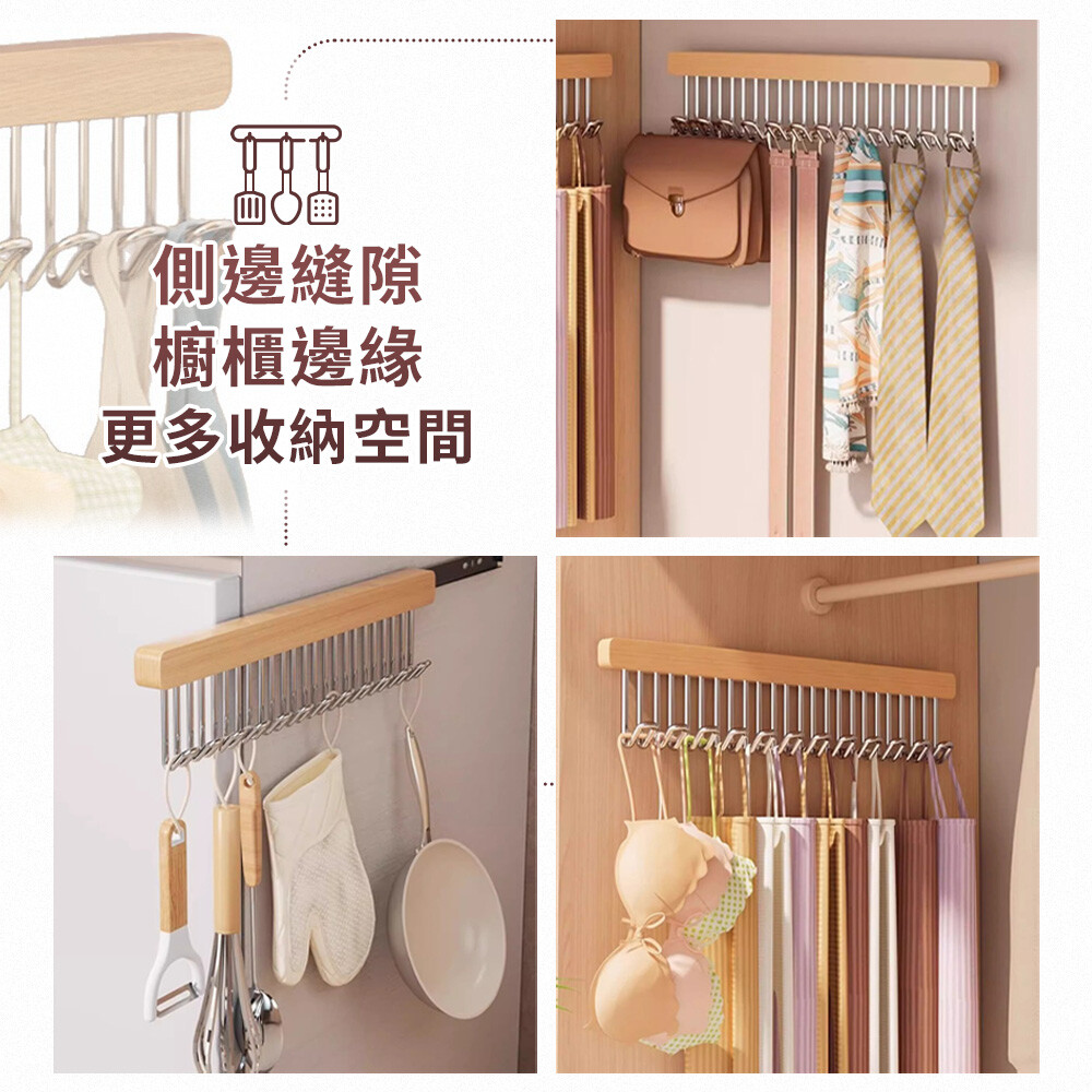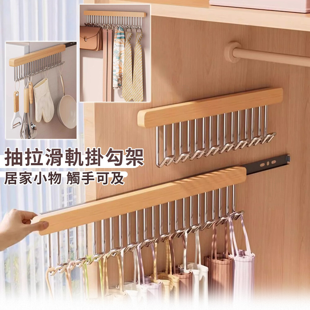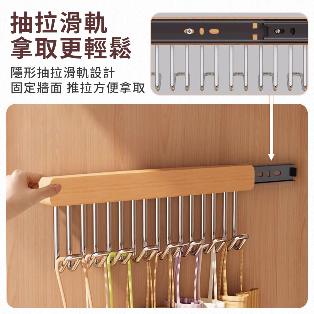 吊掛內衣/圍巾/腰帶/廚具等都適用,整齊好拿取,分左/右側滑軌,可根據需求選擇。
