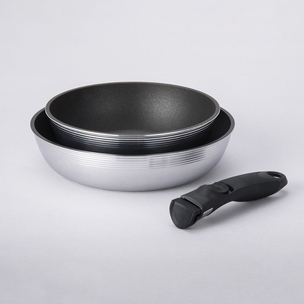 這款 Cast Varius 可拆式手柄平底鍋組,結合 20cm 與 26cm 兩種尺寸鍋具,