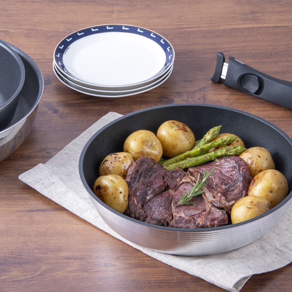 拆下手柄後,鍋體可如餐盤般層層堆疊,節省廚櫃空間,整潔俐落又具收納美感。