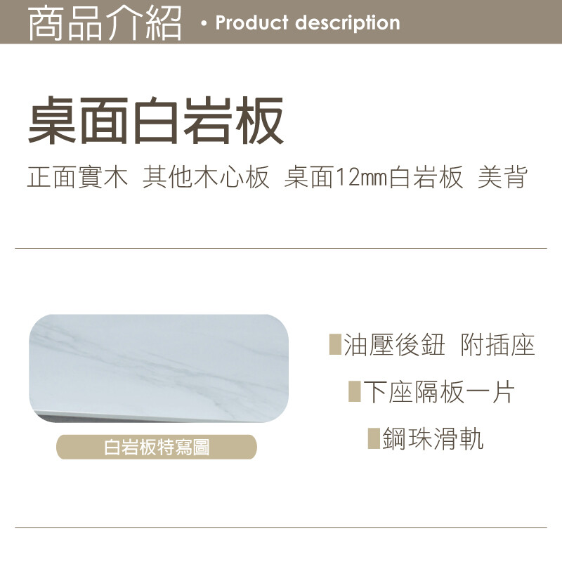 桌面12mm白岩板 油壓後鈕 鋼珠滑軌