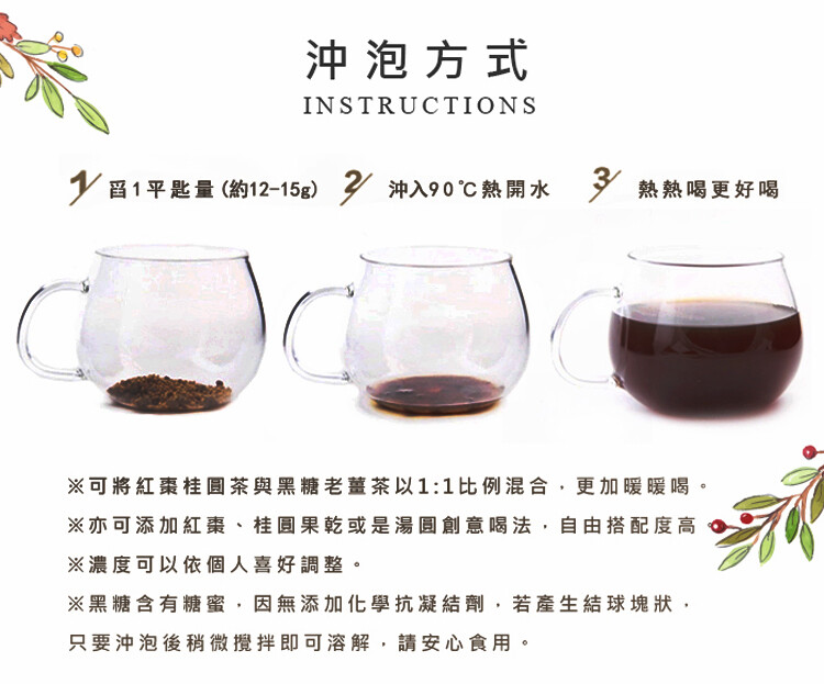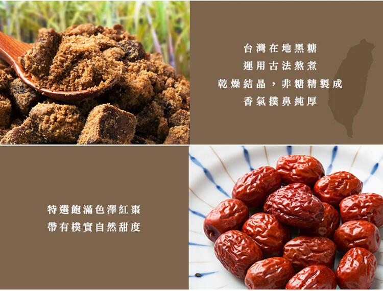 成份:黑糖、糖、桂圓(萃取液)、紅棗(萃取液)、紅棗粉
