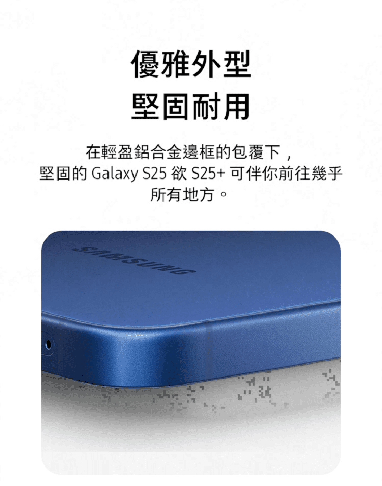 SAMSUNG Galaxy S25+ 機身採圓潤邊角設計,握持更舒適,正面覆蓋康寧大猩猩 Armor 玻璃,具備優化的光學表現與出色的耐用性,能有效抵抗日常刮痕所造成的損害。具備 IP68 防塵防水等級,滿足日常保護需求,無論是遇到下雨、剛洗完手都可以放心使用手機。