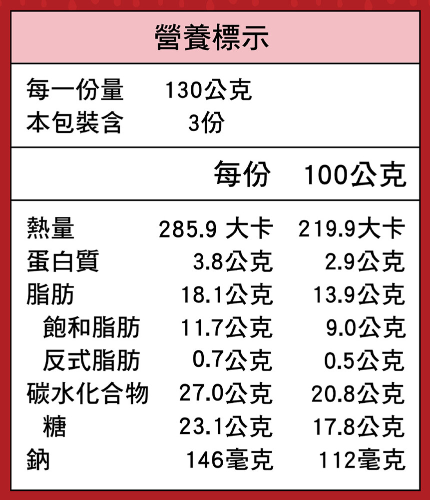 過敏原:本產品含有牛奶、雞蛋、麩質的穀類、大豆,不適合對其過敏體質者食用