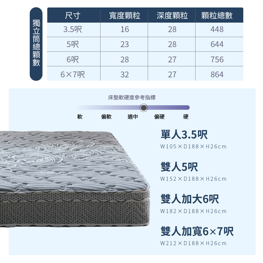 ✓ 獨立筒特性 : 個別支撐人體重量的袋裝獨立筒,讓同床的兩人互不受干擾的特性
