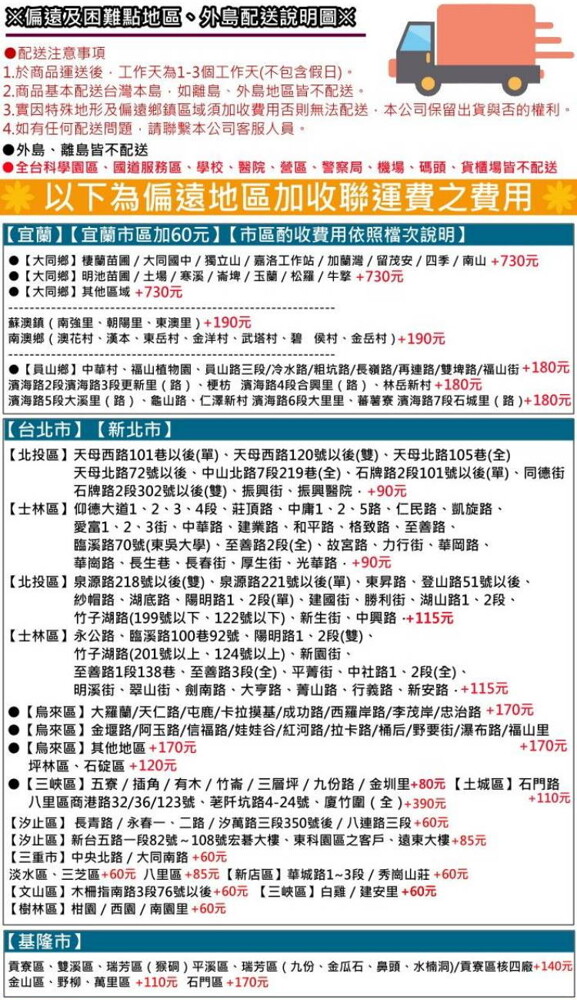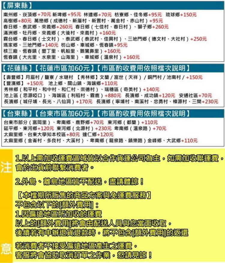 1.以上需加收運費區域皆以合作貨運公司為主,如需加收聯運費,會於出貨前聯繫消費者。