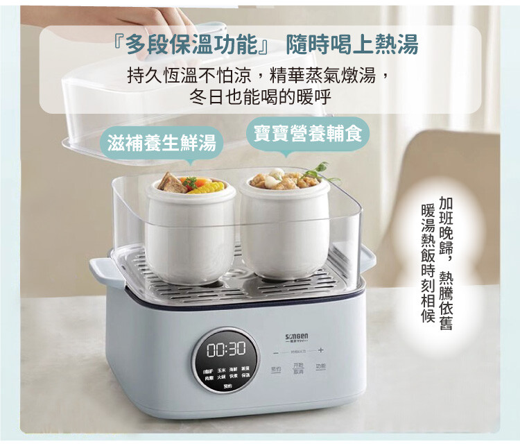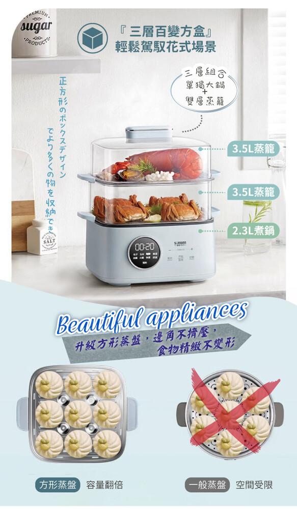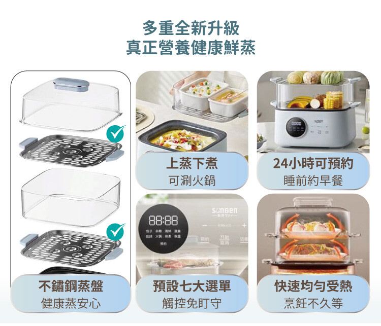 容 量:總容量9.3L(蒸籠單層 3.5LX2層、內鍋 2.3L/水位1.7L)