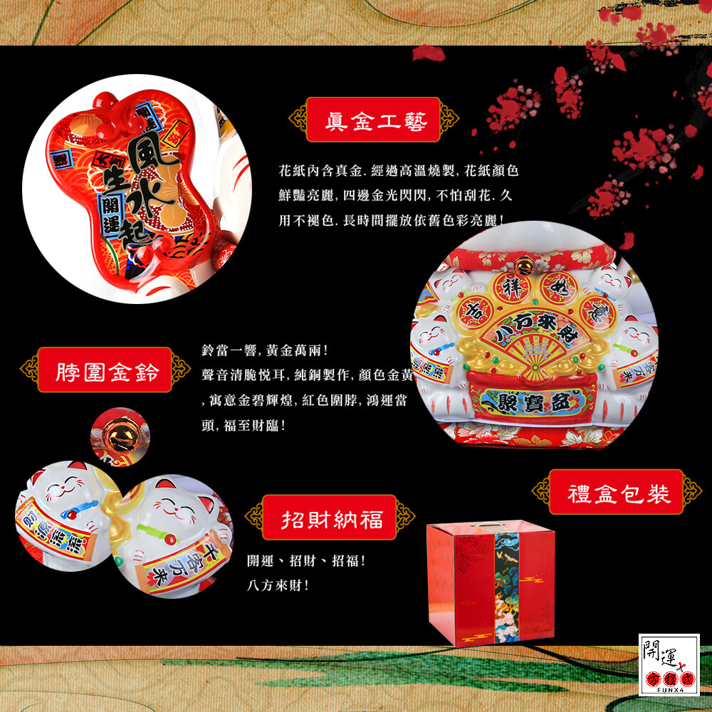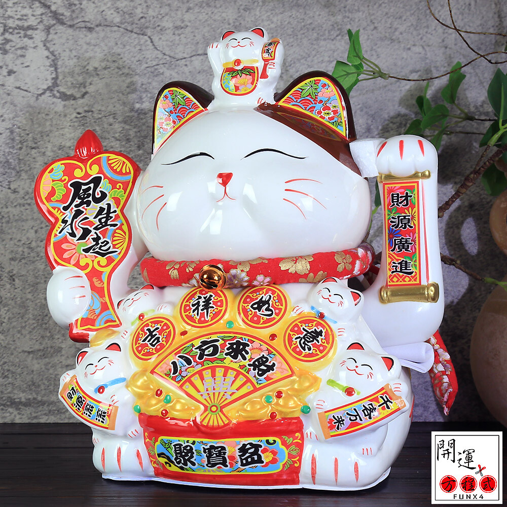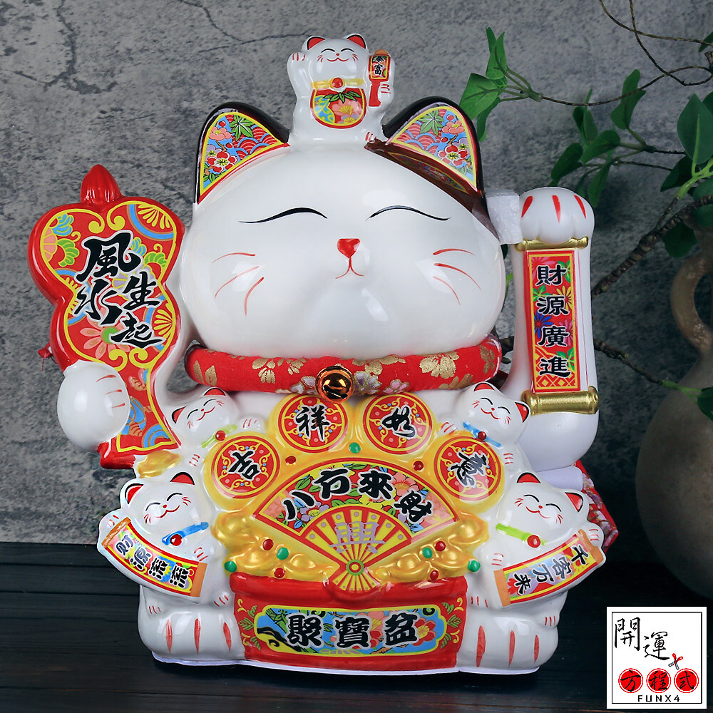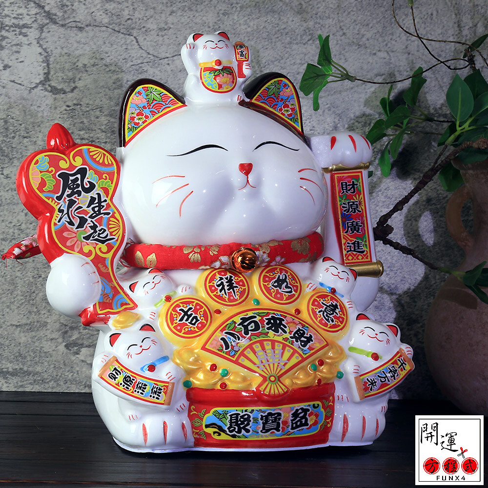 說中,商家的招財貓舉右手可以招白天的來客,舉左手則是招來作夜間生意或特種行業的客人;另外舉右手象徵招財、錢財幸福到來;左手則是象徵招人、客人絡繹不絕、買氣旺。台灣商家既愛招財、又愛人潮的經營模式,台灣業者興起台式招財貓,又招財又招客的舉起雙手好像在喊萬歲,外加肚子上再掛個金元寶的