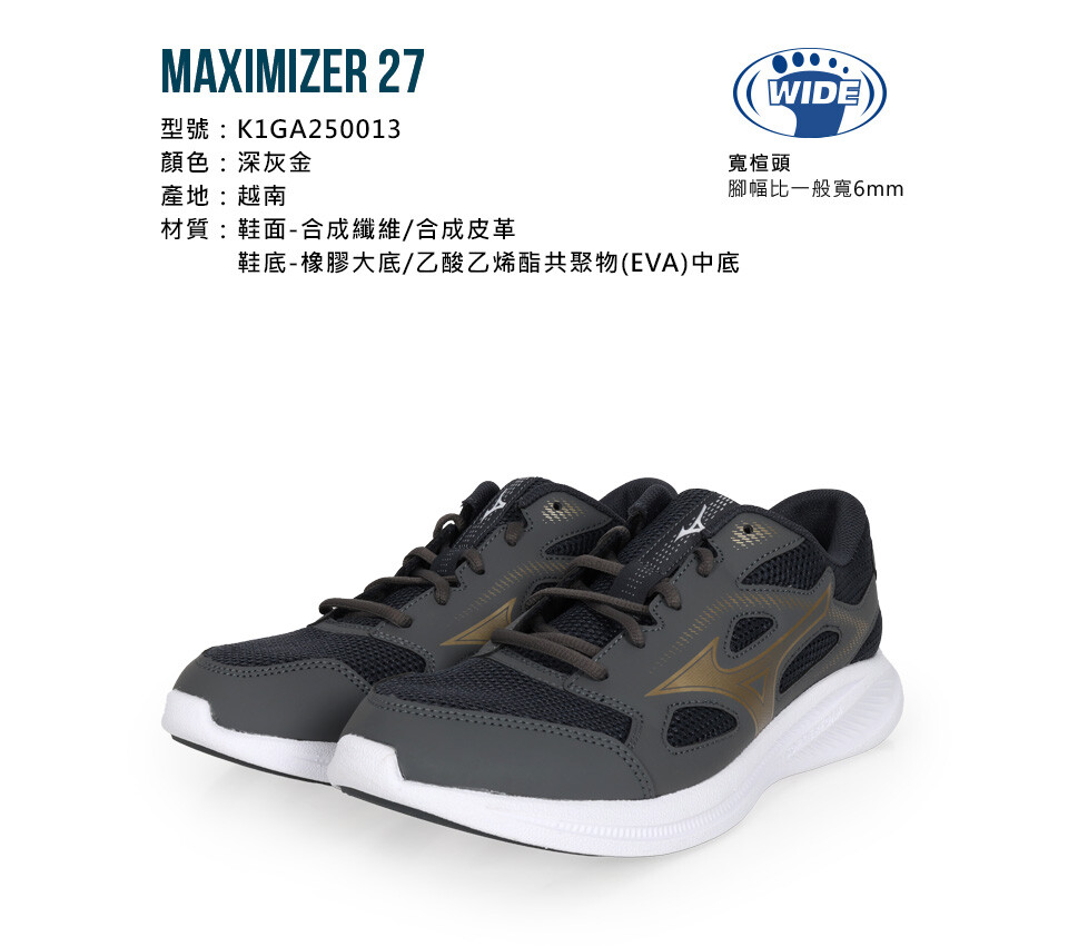 MIZUNO MAXIMIZER 27 男慢跑鞋-3E-運動 寬楦 反光 深灰金