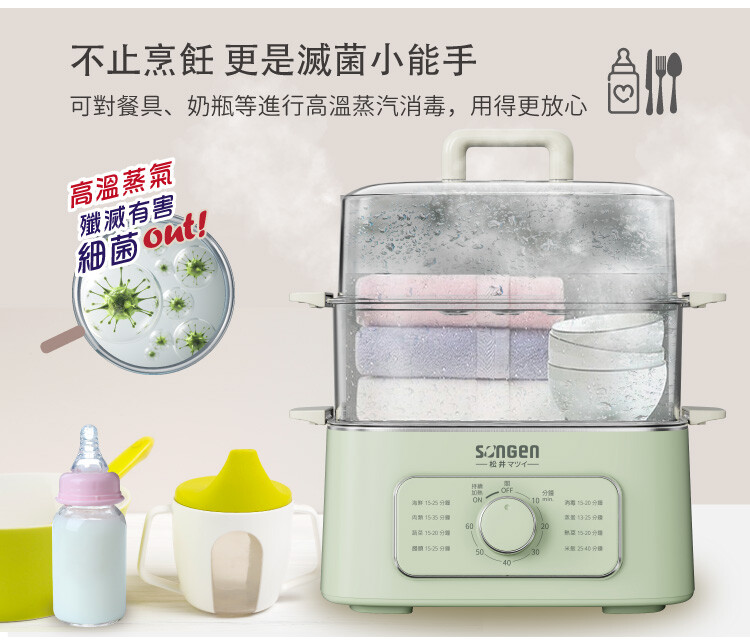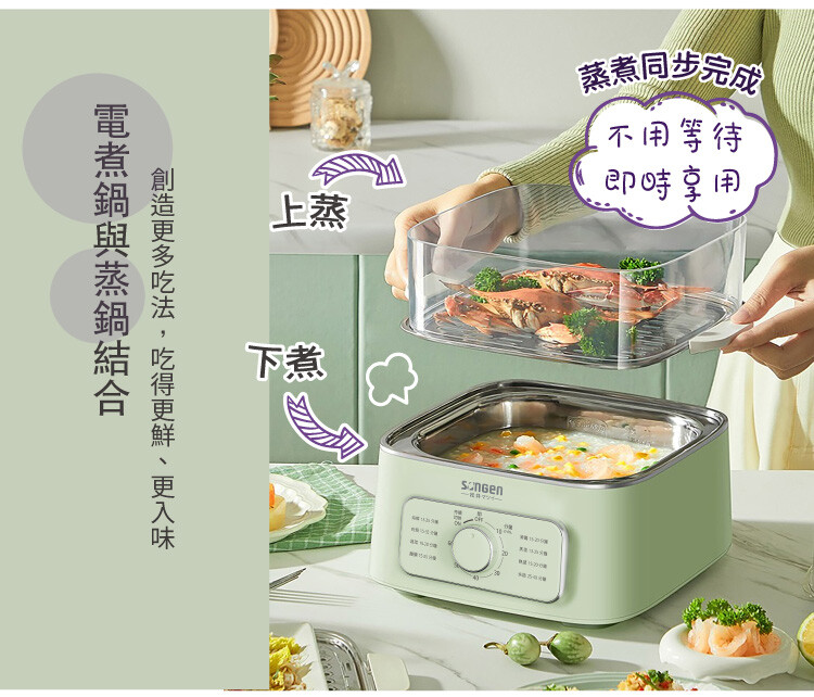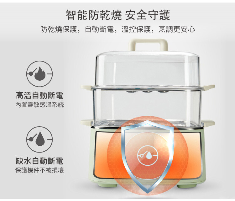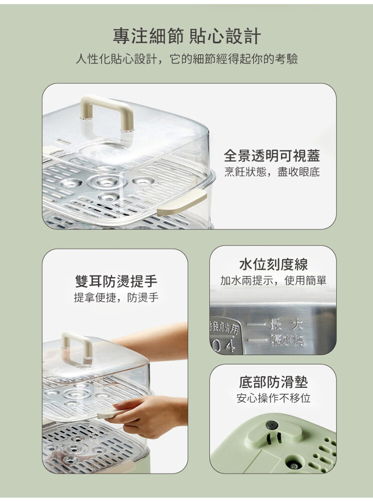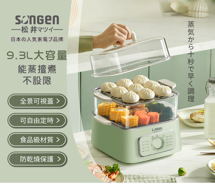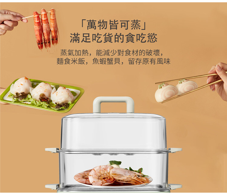 容 量:總容量9.3L(蒸籠單層 3.5LX2層、內鍋 2.3L/水位1.7L)
