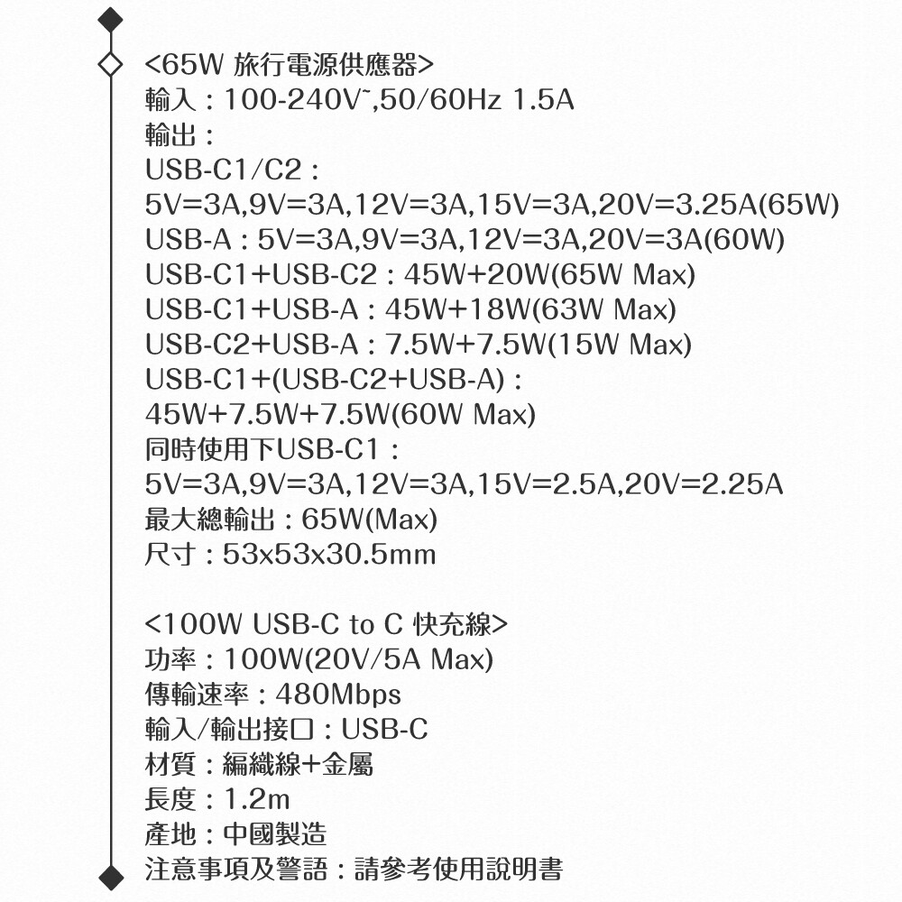 規格:充電效率:100W (20V/5A Max) |傳輸速率:480Mbps