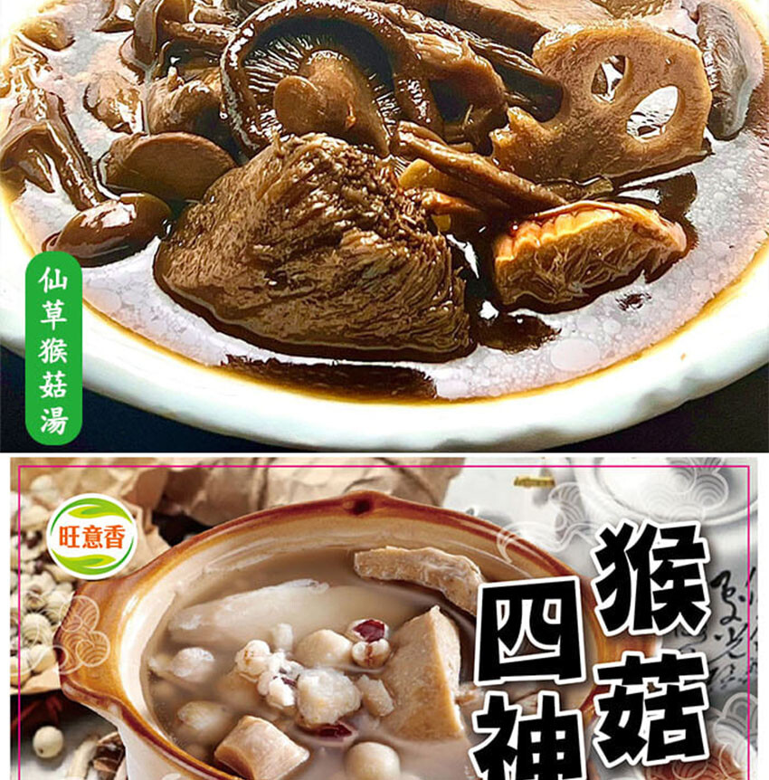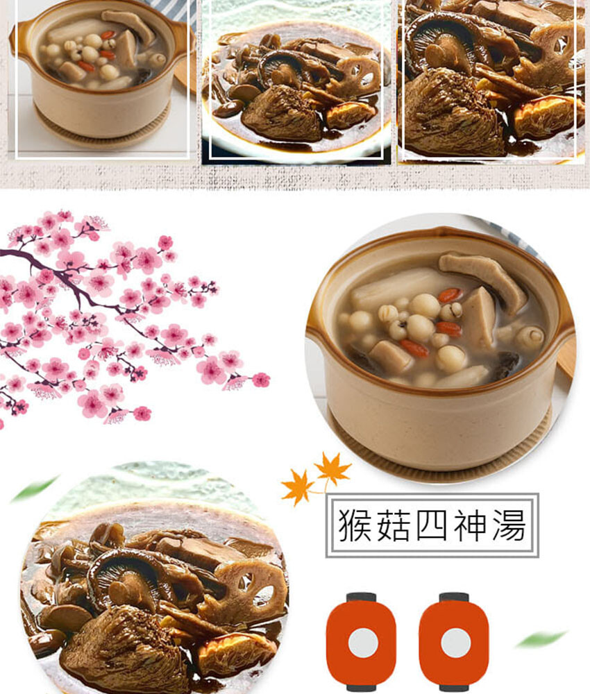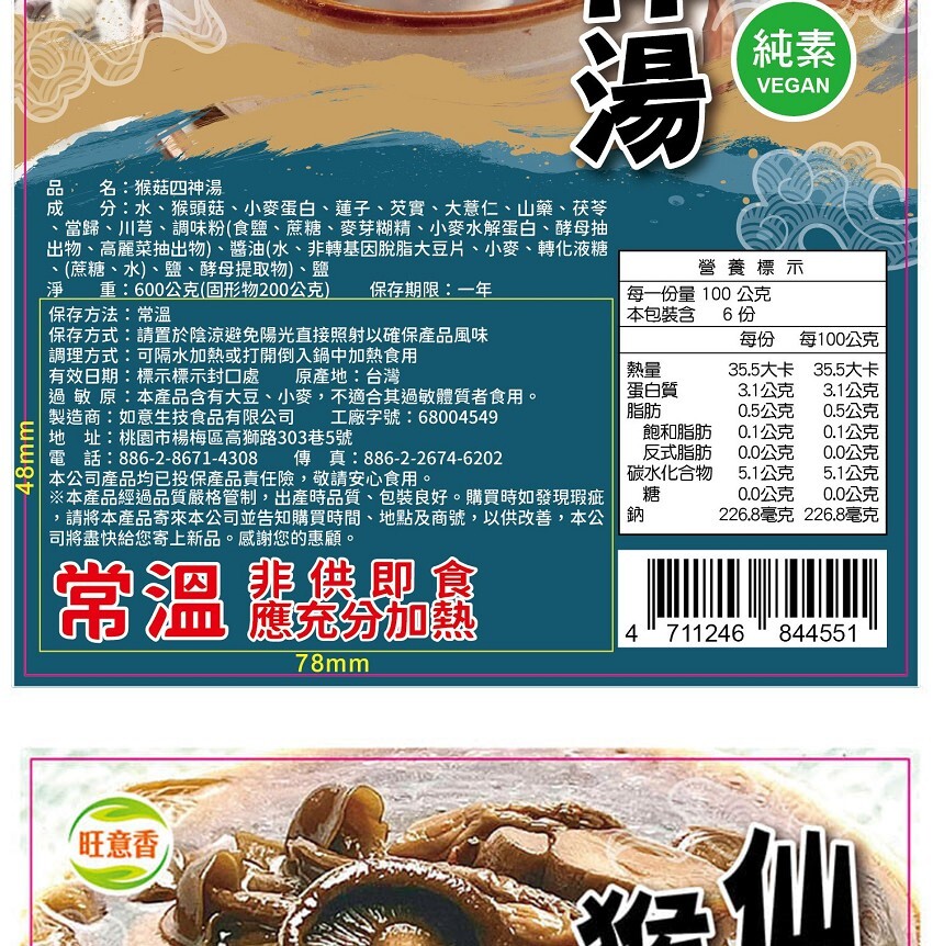 成份:水、猴頭菇、小麥蛋白、蓮子、芡實、大薏仁、山藥、茯苓、當歸、川芎、調味粉(食鹽、蔗糖、麥芽糊精、小麥水解蛋白、酵母抽出物、高麗菜抽出物)、醬油(水、非轉基因脫脂大豆片、小麥、轉化液糖、(蔗糖、水)、鹽、酵母提取物)、鹽