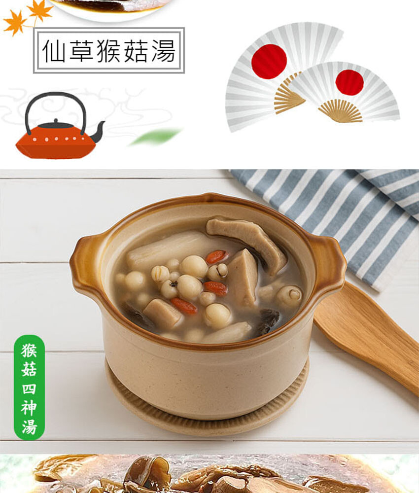固形物:猴頭菇、杏鮑菇、鴻喜菇、蓮藕、鹿茸菇、香菇、薑片、腰果、枸杞、北蟲草