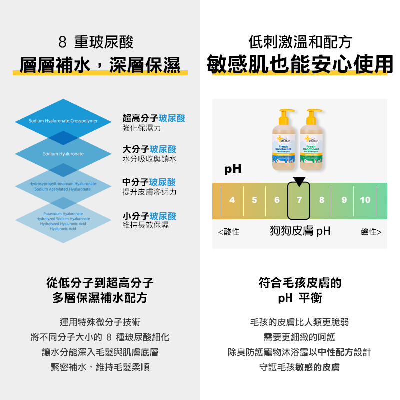 符合毛孩皮膚的pH 平衡,低刺激溫和配方,敏感肌也能安心使用。