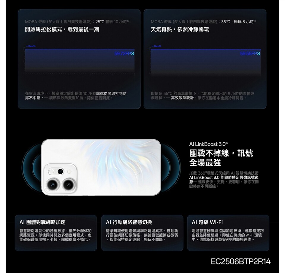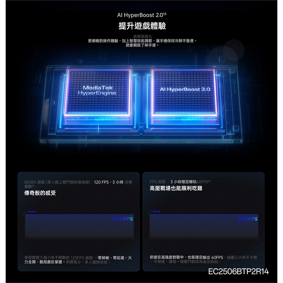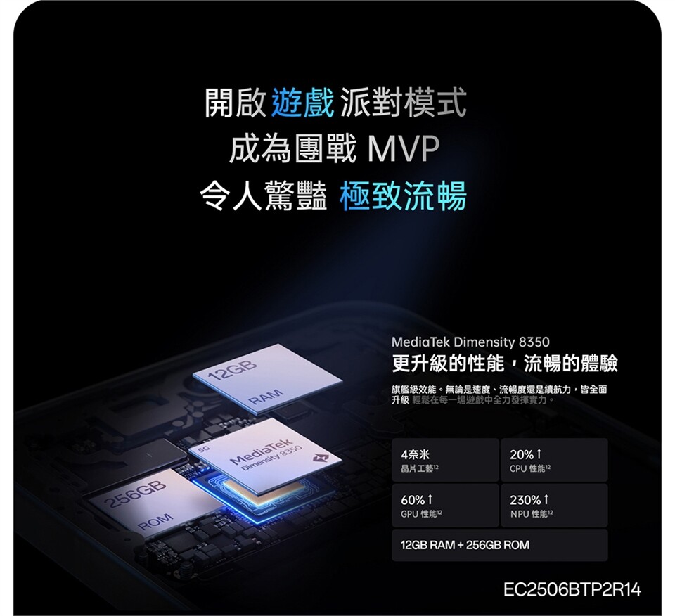 OPPO Reno14 5G 搭載聯發科天璣 8350 處理器,提供 12GB RAM / 256GB ROM、12GB RAM / 512GB ROM 兩種版本,支援 eSIM 和 NFC 感應功能;導入 AI 奈米多重散熱系統,主打旗艦等級的大面積 VC 散熱、導熱材料、以及 AI 溫控算法,控制機身溫度、提升核心運行穩定性。續航方面,配備 6,000mAh 大容量電池,支援 80W SUPERVOOC 超級閃充,無論日常使用或長時間外出,都能提供穩定、持久的續航體驗。