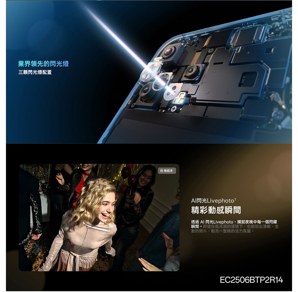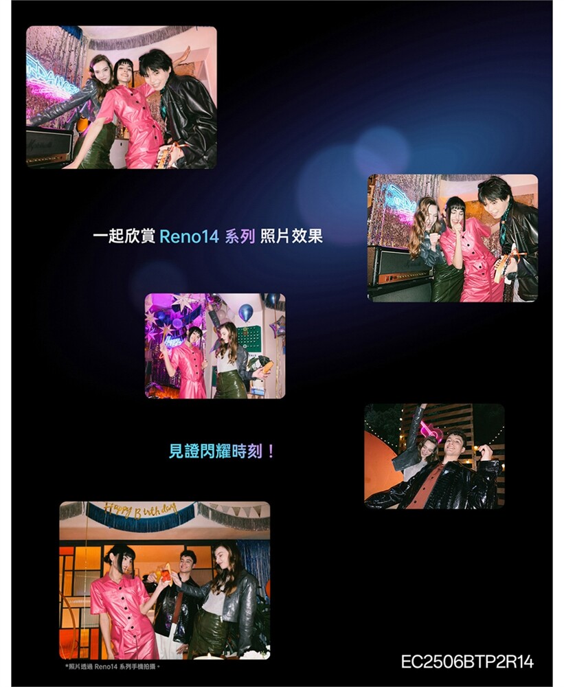 OPPO Reno14 5G 加入全新「AI 閃光影像」,硬體上升級 3 顆閃光燈,不僅支援主鏡頭、超廣角與長焦鏡頭的分區補光,輔以 AI 場景判斷及降噪演算法調節,在逆光、高對比環境中提升曝光與膚色準確度,加上獨家 CCD 風格調教,一鍵拍出復古時尚感。其他還有 AI 靈感成片、AI 表情替換、AI 風格復刻等功能。