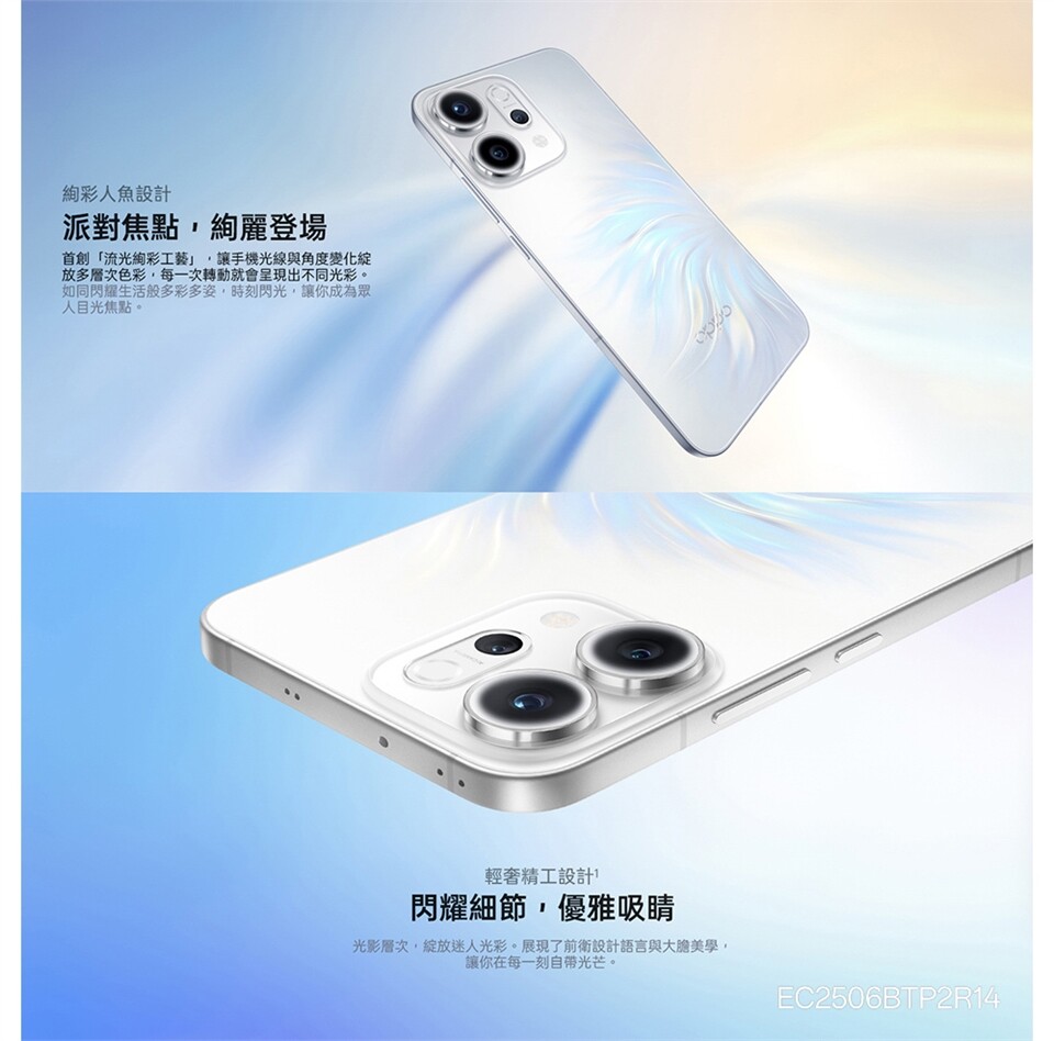 OPPO Reno14 5G 採用全新「絢彩人魚設計」,以超高精度工藝實現一機十色的多彩變幻紋理,漸變的流光幻彩猶如人魚般透亮潔淨,從不同角度呈現清透光影層次;搭載獨家「珊瑚絨玻璃」,兼具親膚柔順的絲滑手感與溫潤質地。機身採用防摔耐用的航太級金屬中框,通過 IP69 防塵防水測試、支援濕手螢幕觸控功能,帶來安心的全天候使用體驗。