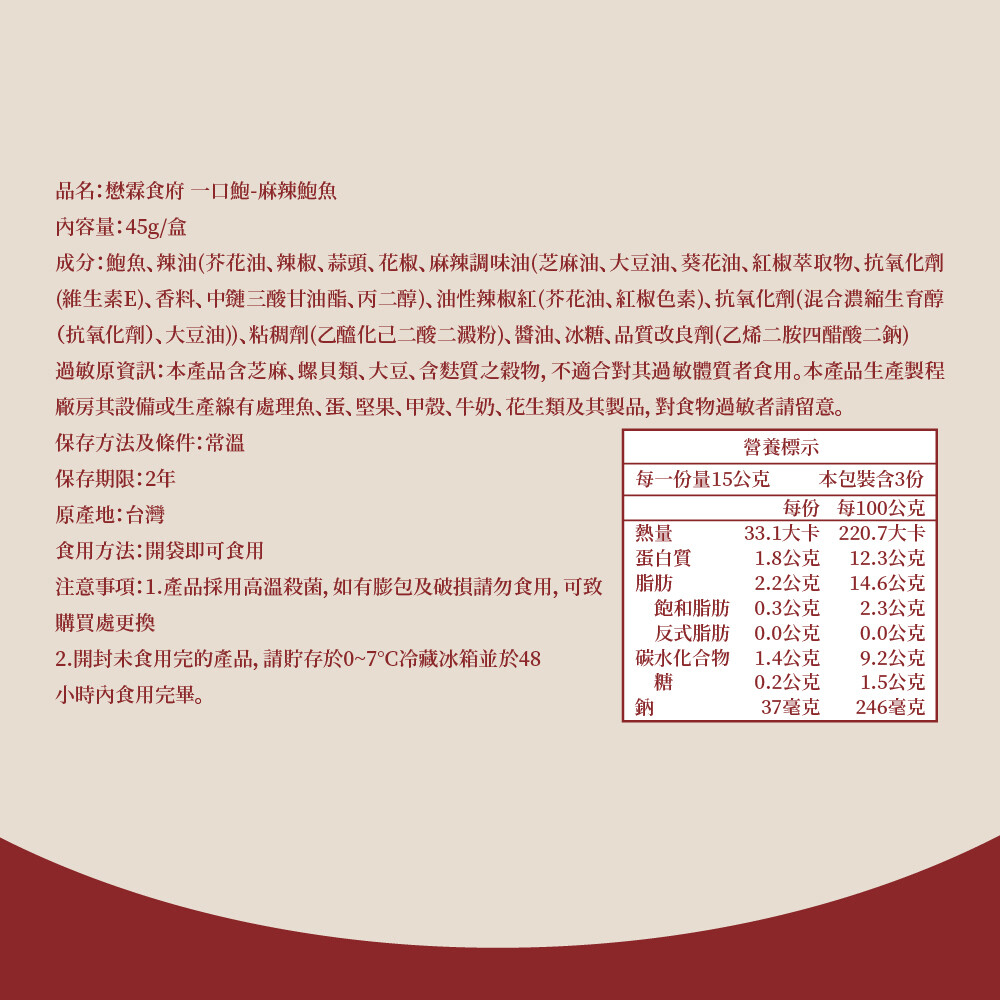 【懋霖食府】一口鮑魚-麻辣鮑魚45g/盒