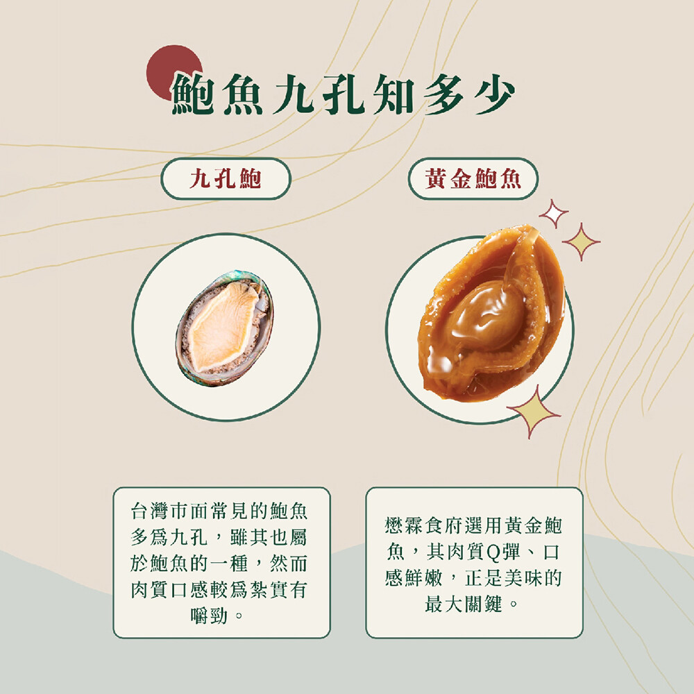 成分:水、鮑魚、芝麻油、米酒、冰糖、砂糖、三杯粉(食鹽、L-麩酸鈉、蔗糖、焦糖色素、蒜頭、多磷酸鈉、辣椒、薑、香料(玉米油、香料)、二氧化矽、薑抽出物、紅椒色素、蒜頭抽出物、羅勒抽出物)、蒜頭、薑、羅勒葉、醬油、剁椒醬(辣椒、米酒、白醋、辣豆瓣醬(辣椒、水、豆瓣醬(黃豆(基因改造)、水、小麥、鹽)、蔗糖、食鹽、調味劑(L-麩酸鈉、乳酸、5'-次黃嘌呤核苷磷酸二鈉、5'-鳥嘌呤核苷磷酸二鈉)、香油(大豆油、芝麻油))、薑、蒜頭、檸檬汁、精鹽、健美鮮CL(麥芽糊精、食鹽、蔗糖、酵母抽出物、黃豆水解蛋白、香菇抽出物、高麗菜抽出物)、調味劑(L-麩酸鈉、5'–次黃嘌呤核苷磷酸二鈉、5 '–鳥嘌呤核苷磷酸二鈉、琥珀酸二鈉、胺基乙酸、DL-胺基丙酸)、冰糖、砂糖、調味劑(檸檬酸))、蠔油(水、糖、鹽、粘稠劑(羥丙基磷酸二澱粉)、蠔汁(水、鹽、蠔、調味劑(L-麩酸鈉))、調味劑(L-麩酸鈉、5'–次黃嘌呤核苷磷酸二鈉、5 '–鳥嘌呤核苷磷酸二鈉、乳酸)、著色劑(焦糖色素)、丙二醇)、粘稠劑(乙醯化己二酸二澱粉)、調味劑(L-麩酸鈉、胺基乙酸、琥珀酸二鈉、岩鹽、5'–次黃嘌呤核苷磷酸二鈉、5'–鳥嘌呤核苷磷酸二鈉)