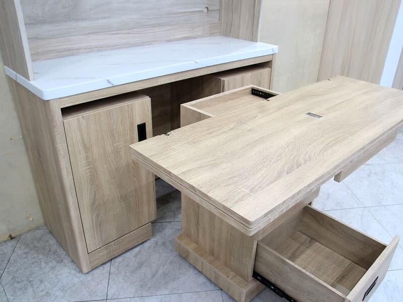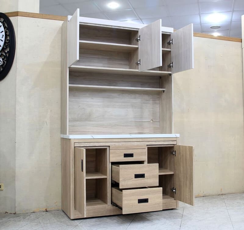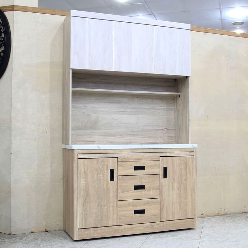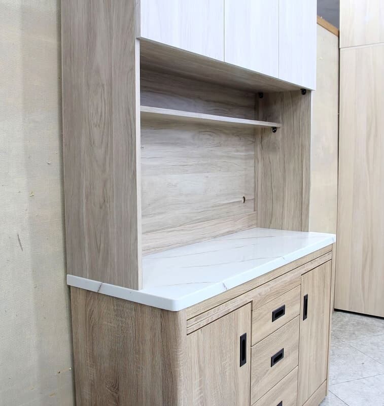 | 材質 | 板材 : 桶身,面板,門板及內部隔板皆為木心板材 塗裝 : 下座梧桐色耐磨木皮,左右圓弧安全角,上座淺梧桐+白梧桐色雙色木皮 五金 : 全組鋼珠滑軌,內嵌黑鐵把手,門片緩衝後鈕不易碰撞,桌面附雪白銀狐石面 |