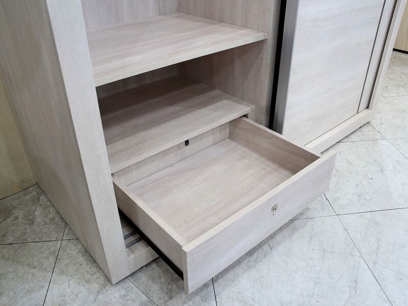 | 材質 | 板材 : 桶身,門片,抽屜面板,抽牆及內部隔板皆為木心板材 塗裝 : 白梧桐色耐磨木皮 五金 : 全組鋼珠滑軌,門片鋁框包覆 , 上下鋁條軌道,內建一抽附鎖及一片活動隔板 |