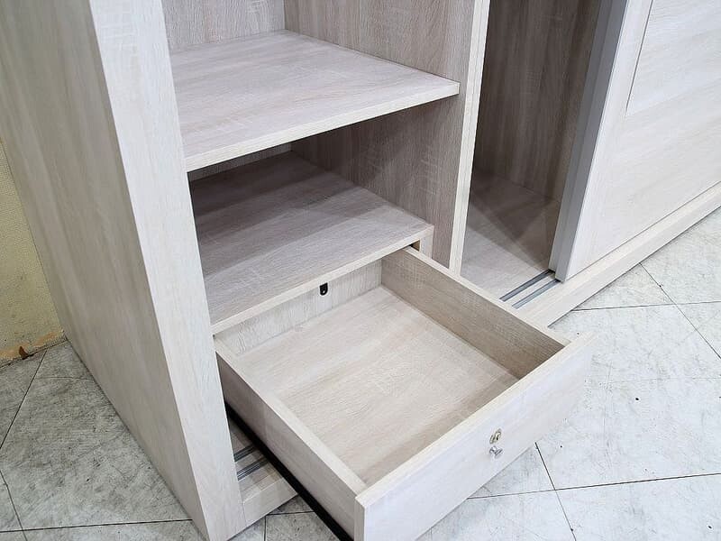 | 材質 | 板材 : 桶身,門片,抽屜面板,抽牆及內部隔板皆為木心板材 塗裝 : 白梧桐色耐磨木皮 五金 : 全組鋼珠滑軌,門片鋁框包覆 , 上下鋁條軌道,內建一抽附鎖及一片活動隔板 |