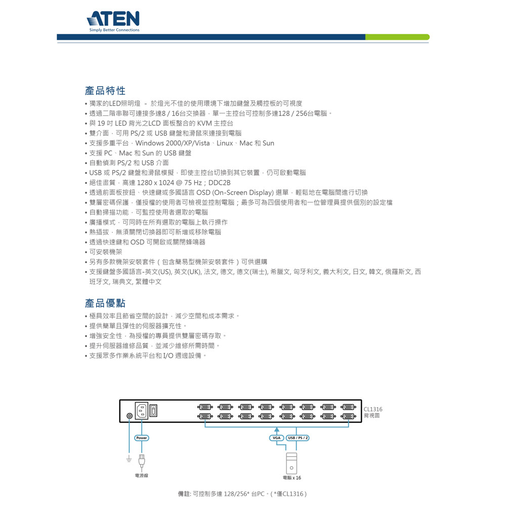 透過二階串聯可連接多達8台交換器,單一主控台可控制多達128台電腦