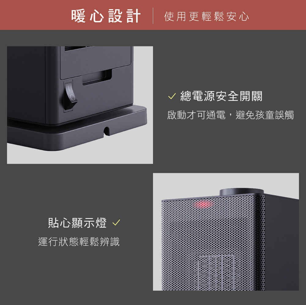 高效率PTC陶瓷發熱,3秒鐘瞬間加熱,雙渦輪直流風扇,送暖更快。