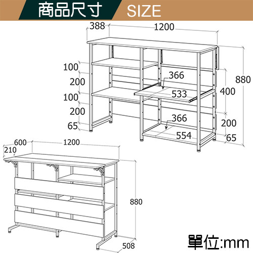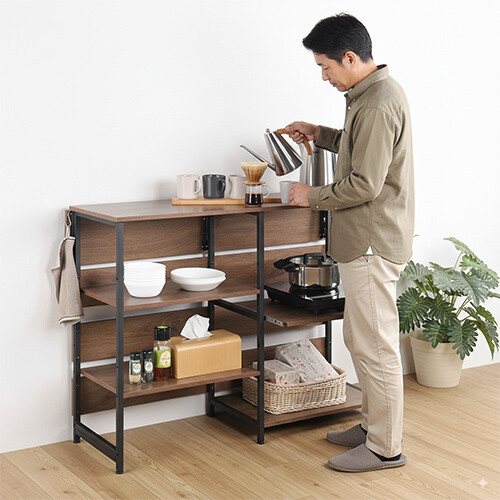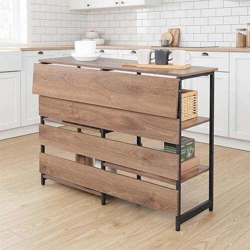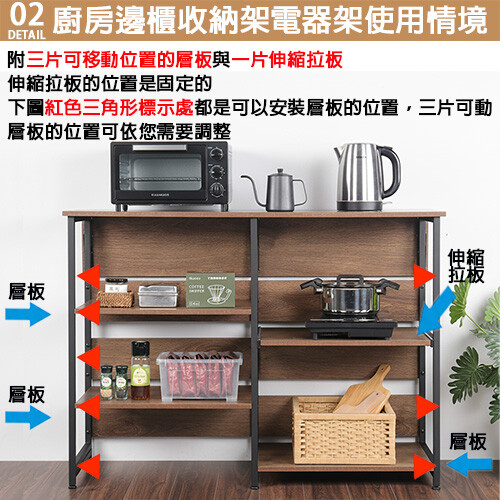 桌面可折合/可加寬的設計,撐開小桌板並拉出延伸腳就是一組好用的廚房中島或吧檯桌。有三個層板可移動安裝位置,有一個伸縮拉板,收起桌面靠牆放置時就是一組實用的廚房置物收納電器架。