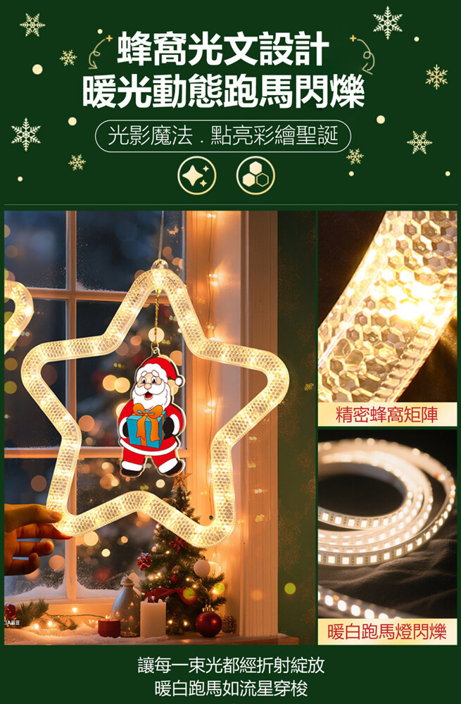 ● 蜂窩光文設計,暖光動態跑馬閃爍