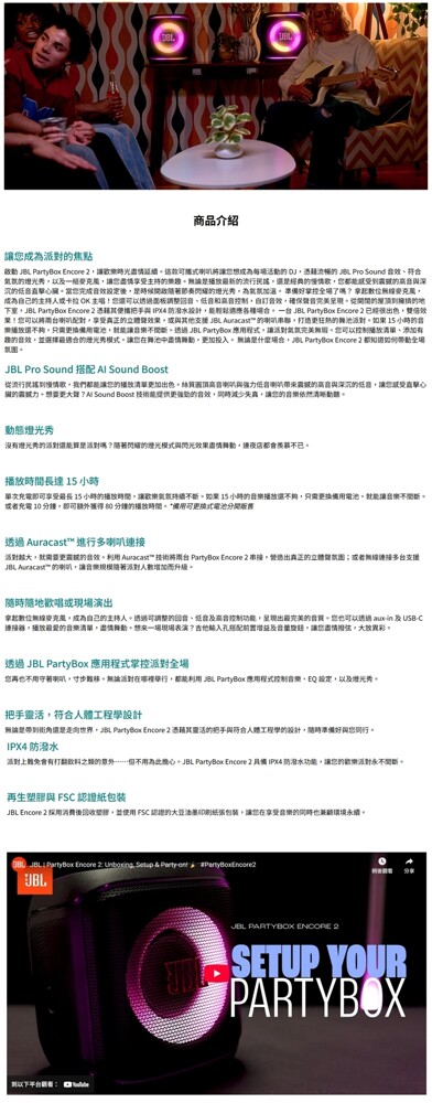 JBL Pro Sound 搭配 AI Sound Boost / 動態燈光秀 / 播放時間長達 15 小時 / 透過 Auracast™ 進行多喇叭連接 / 隨時隨地歡唱或現場演出 / 只要透過 JBL PartyBox 應用程式,就能掌控派對全場 / 把手靈活,符合人體工程學設計 / IPX4 防潑水 / 再生塑膠,加上 FSC 認證的紙包裝/商檢字號:R63234 NCC字號:CCAM25LP0280T2