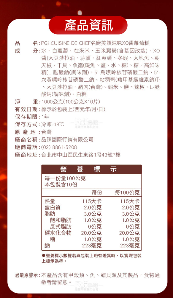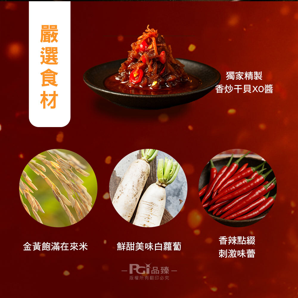 辣味:水、白蘿蔔、在來米、玉米澱粉(含基因改造)、XO醬{大豆沙拉油、蒜頭、紅蔥頭、冬蝦、大地魚、朝天椒、干貝、魚露(鯷魚、鹽、水、糖)、糖、高鮮味精[L-麩酸鈉(調味劑)、5'-鳥嘌呤核苷磷酸二鈉、5'-次黃嘌呤核苷磷酸二鈉、粘稠劑(羧甲基纖維素鈉)]}、大豆沙拉油、豬肉(台灣)、蝦米、鹽、辣椒、L-麩酸鈉(調味劑)、白糖