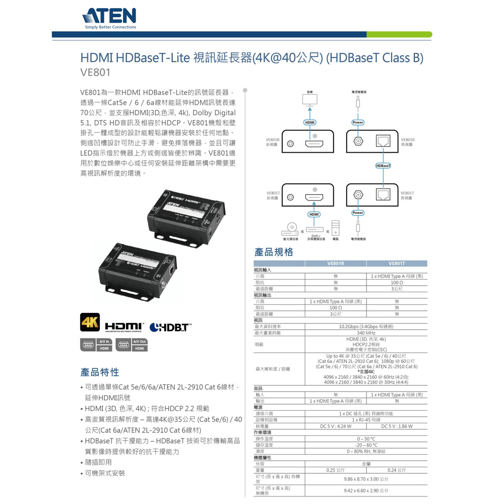 高畫質視訊解析度 – 高達4K@35公尺 (Cat 5e/6) / 40公尺(Cat 6a/ATEN 2L-2910 Cat 6線材)