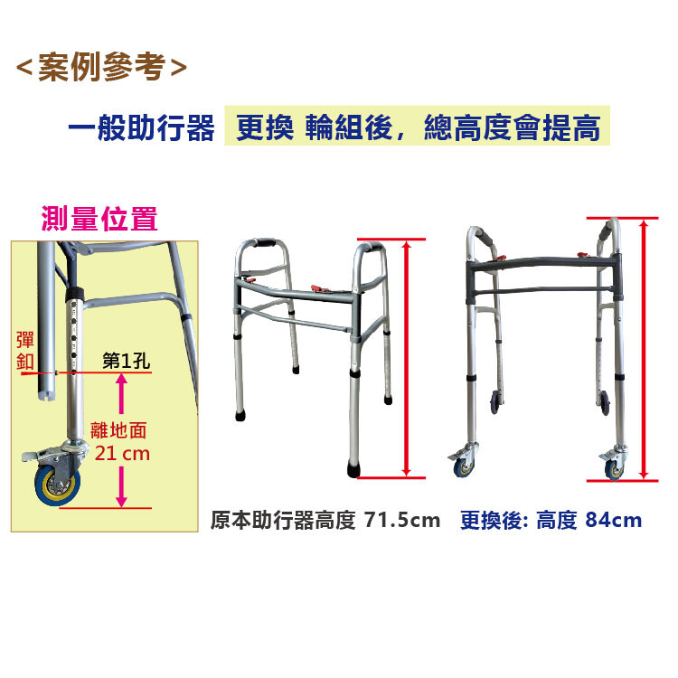 >請詳閱內文【注意事項】: 因安裝後助行器整體高度會變高, 請確實測量並確認適合使用者[身高]使用再購買。謝謝您~