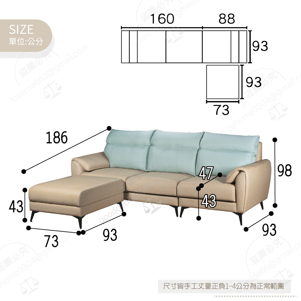 三人沙發:寬248×深93×高98公分
