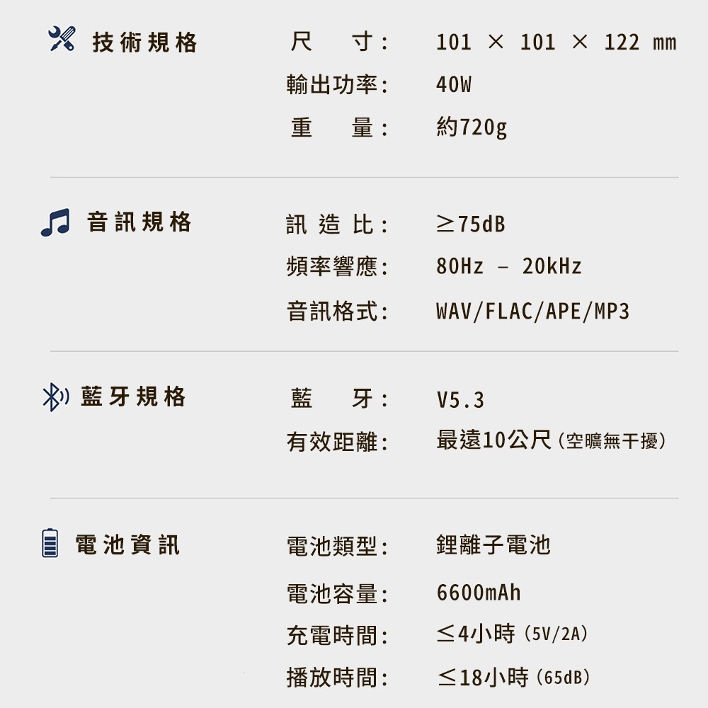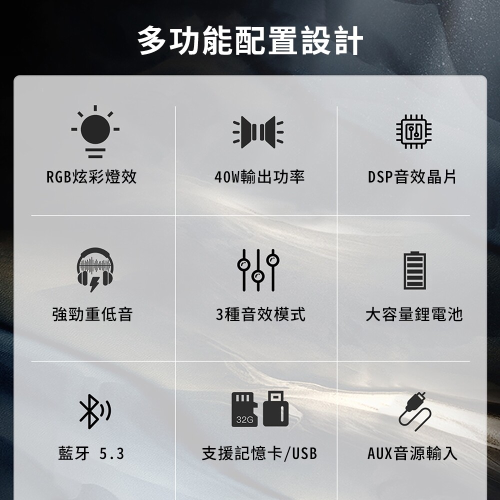 結合 RGB 炫彩燈效、40W 高功率輸出與 DSP 晶片調音,讓音質更純淨動人。支援藍牙 5.3、記憶卡/USB 與 AUX 輸入,多種播放方式滿足不同需求。搭配大容量鋰電池,使用更靈活便利。