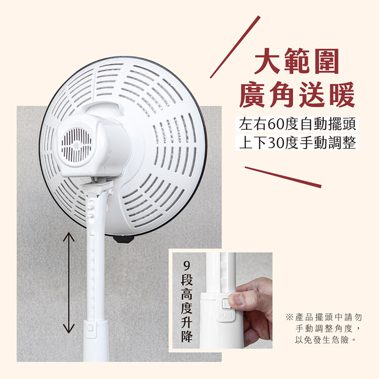 .左右60度自動擺頭,上下手動30度角度調整,大範圍廣角送暖