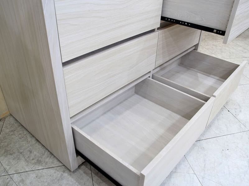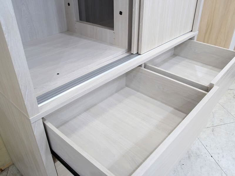 | 材質 | 板材 : 桶身,門片, 抽屜門板皆為木心板材 ,堅固耐用 塗裝 : 洗白色耐磨木皮 , 灰橡色木皮點綴 五金 : 內建六抽採雙截式鋼珠滑軌, 門片上下寬板鋁合金滑軌 |