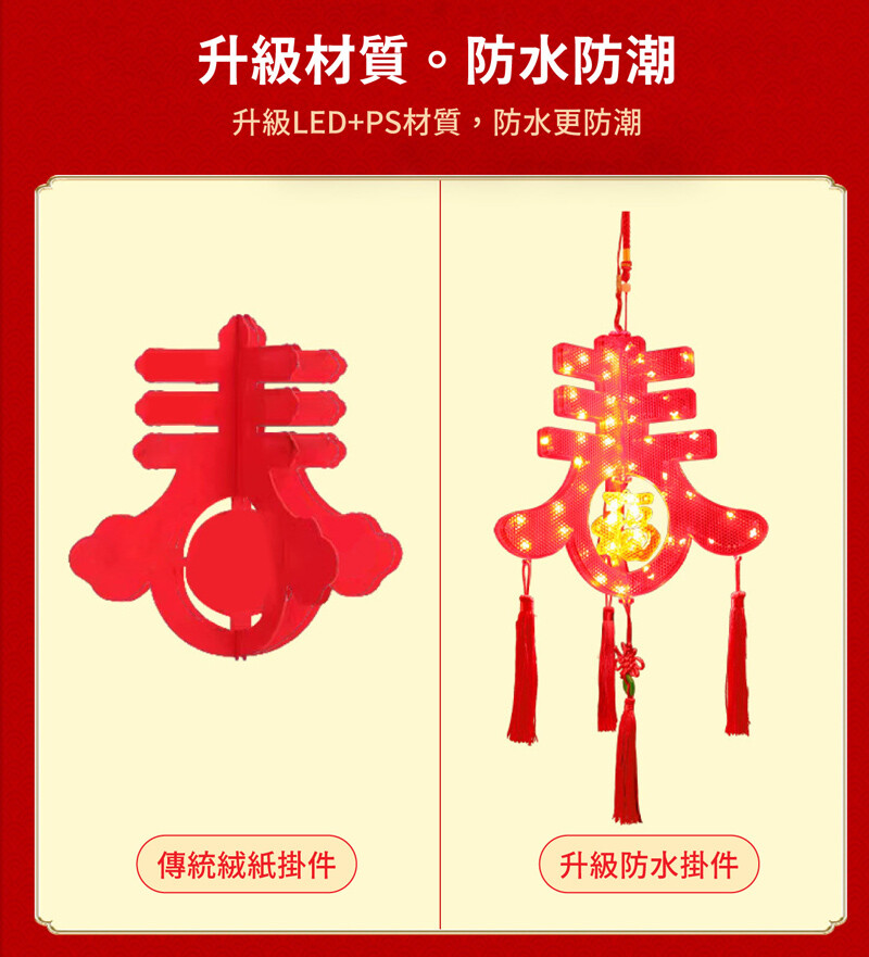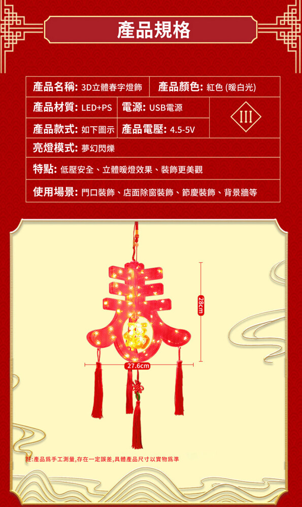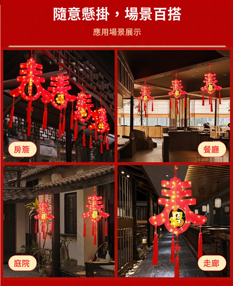 ● 三面立體「春」字擺飾,夢幻閃爍亮燈