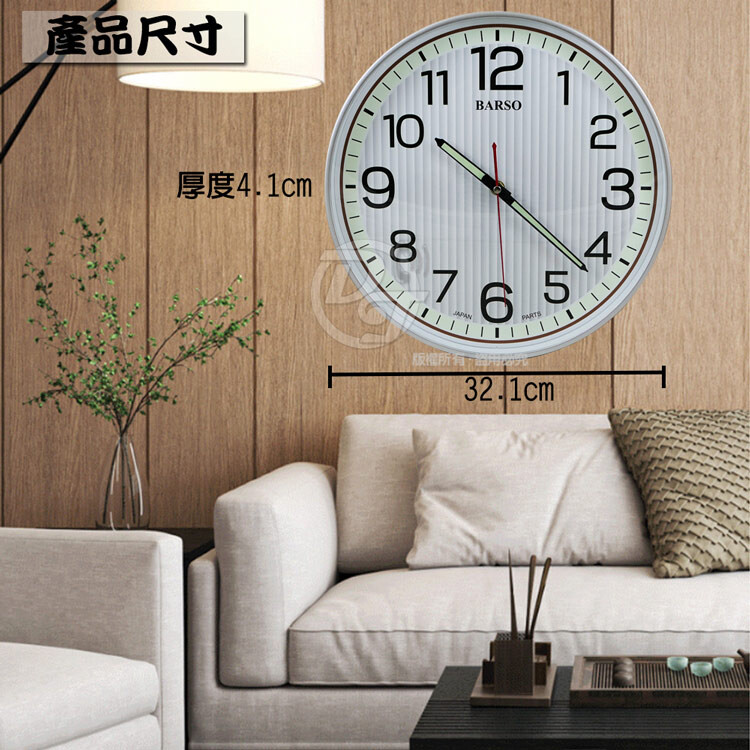 ◎品名:BARSO 亮銀の大字夜光靜音掛鐘 BS-802
