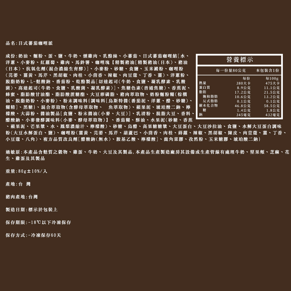 成份 | 奶油、麵粉、蛋、鹽、牛奶、燻雞肉、乳酪絲、小蕃茄、日式蕃茄咖哩