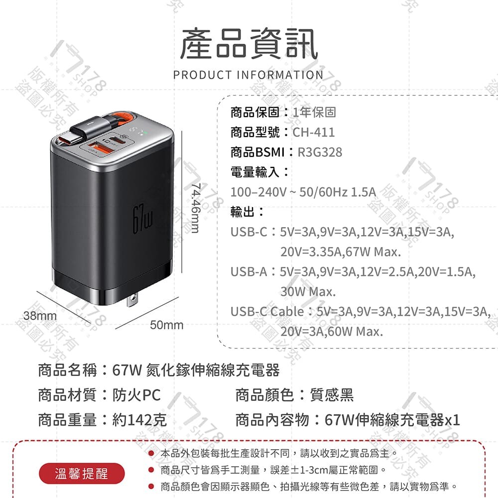 商品內容:67W 氮化鎵伸縮線充電器 ×1
