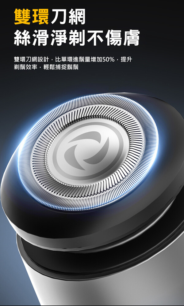 雙環刀網絲滑淨剃不傷膚-雙環刀網設計,比單環進鬚量增加50%,提升刮鬍效率,輕鬆捕捉鬍鬚