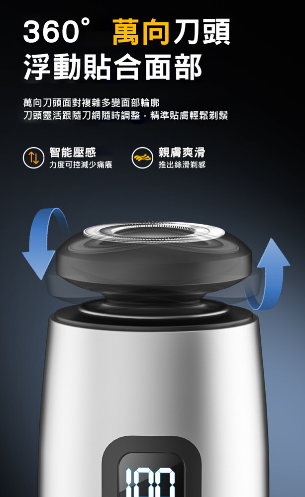 360°萬向刀頭浮動貼合臉部-萬向刀頭面對複雜多變臉部輪廓刀頭靈活跟隨刀網隨時調整,精準貼膚輕鬆剃鬚
