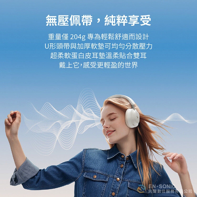 204克超輕量設計,搭配U型頭梁與加厚襯墊,蛋白皮耳罩柔軟親膚,長時間佩戴依然舒適無負擔。